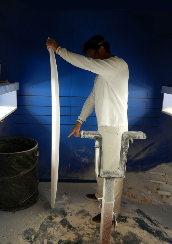 コンケーブがっつりに見えますが、シェイプの過程を見ていると、ただ掘られているのでは無いことが分かります。途中は引っかかり過ぎず、テールにかけてエッジがきっちりと効いてくるように調整してあるのです。