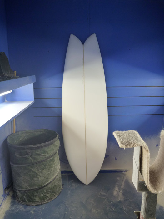 自分的にはかなり短い、5’8”のフィッシュ。海で使ってみて、5’6”でもいけそうだなあと思ったのは、それまでに考えてきたいくつかのポイントに加えて、この5キロがかなり大切なポイントになっていると思います。