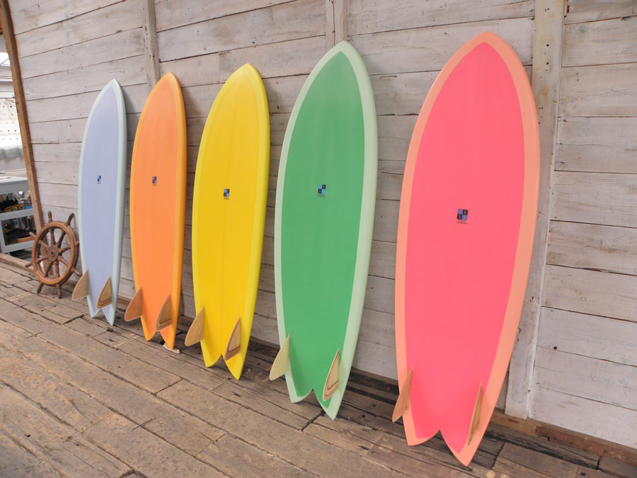 2017年の春から乗り始めた、活さんのフィッシュ。BONITAと呼んでいるモデルです。最初のボードは、一番手前のピンク色の5’8”。