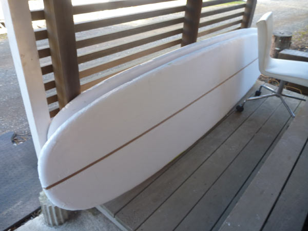 私のニューボード、完成しました。9’9” x 23” x 3”1/8 グライダーです。1/2インチ レッドシダーストリンガーのブランクスを使い、ボランクロスでラミネートしました。重量はおよそ11㎏。重すぎず、軽くもなくといった感じです。