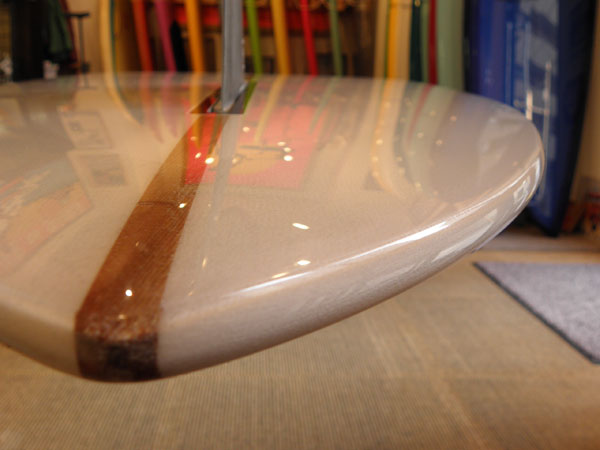 いままでのログと一番の違いは、画像でも分かると思いますが、レールのエッジです。テールエンドまできっちり角が立っているのが見えると思います。ボトム側から少しだけ上がったところのレールにポイントを持たせていますが、ボードの後方3分の1にはさらにラミネートの工程でエッジを強調して付けてもらうようにお願いしました。