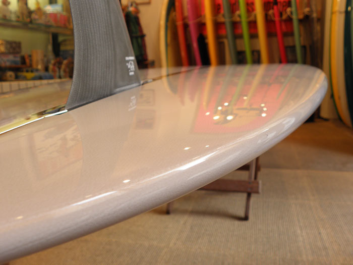 ボトムはスムースで抵抗が無いシェイプです。海に浮かべてパドルをしてみれば、そのスムースさがすぐに分かると思います。当然、滑り出しの感触も違います。ノーズコンケーブが抵抗になっているのがよーく分かると思います。
