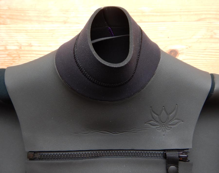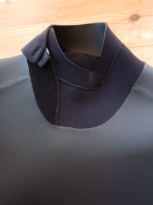 首回りはきれいにフィットしますので、海水の侵入は少なそうです。さらに海水を入りにくくする折返しネックのオプションもあります。