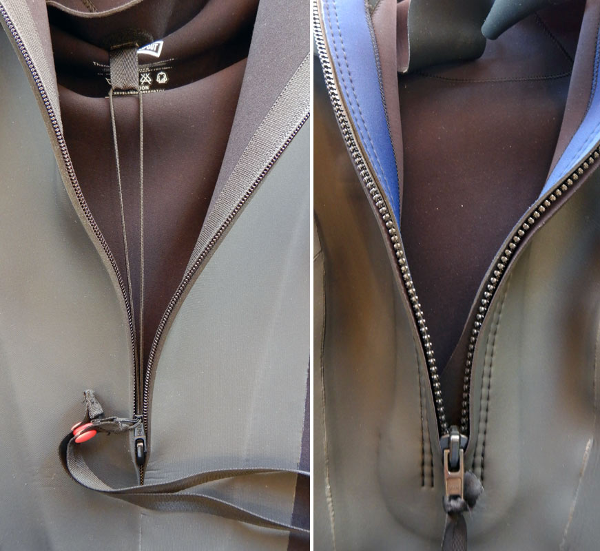 そして背中のジッパーです。比較しやすいように従来の3mmフルスーツと並べてみました。