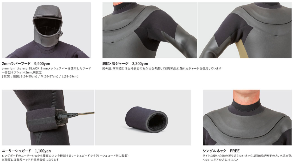 左上はスーツと一体型のフード。寒冷地向けです。湘南ではストレスフリーフードで十分対応できます。