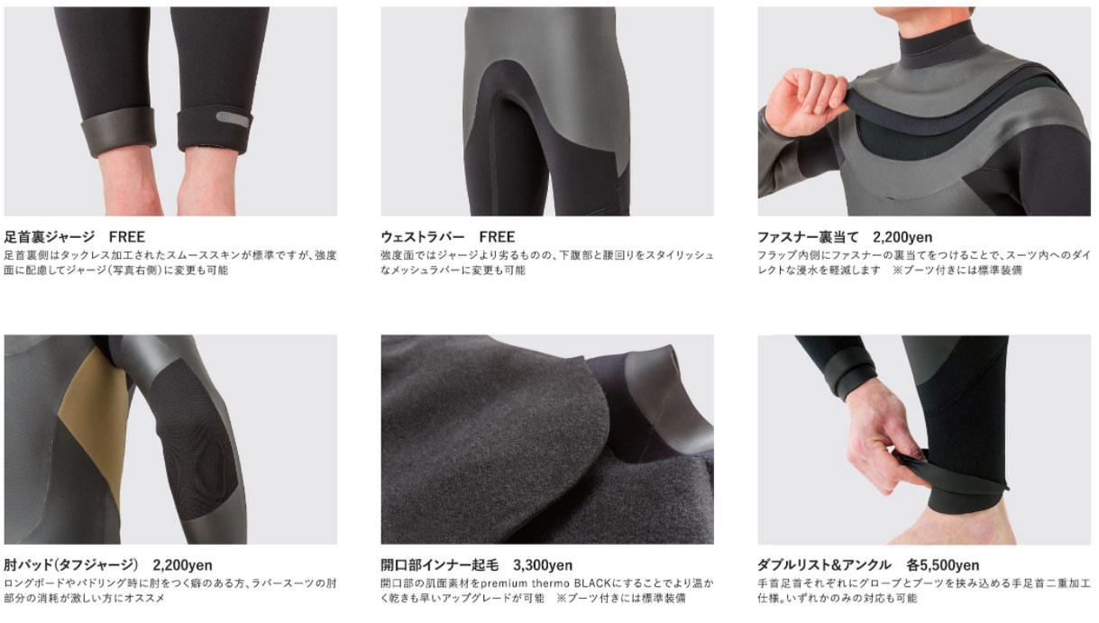 私はオール3ミリですが、5/3ミリの標準仕様で北関東の冷たい海でも問題ありません。さらに防水性と保温性を高めるオプションがあるので、ご自分に合わせて選んでください。お手伝いいたします。