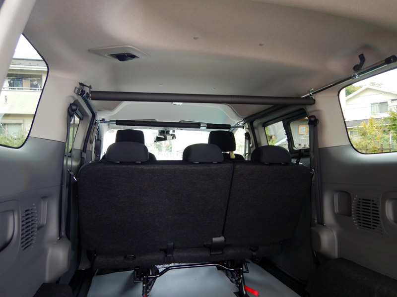 ルーフのキャリアを取り付けて、次は車内のキャリアです。自分のアタマの上のスペースを使ってボードを収納するのですが、少々問題があります。私のNV200はバン(商用車)ではなく、ワゴン(乗用車)です。バンは車内の内張がなく、鉄板のネジ穴などがそのままなので、それを利用していろいろと取り付けることができるのですが、これがワゴンになると、すべと内張に覆われて、取り付ける部分がほぼありません。