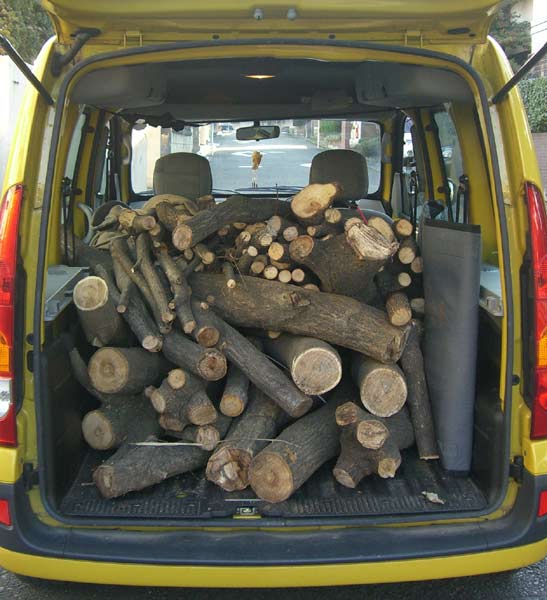 一昨日の夜、近所の造成地で木を切っていたのでそこの地主さんにお許しをいただいて薪拾いをしてきました。車の前が上がっちゃうほどずっしりと(切ったばかりの木って想像以上に重たいんですよ。子供の背丈くらいの太めの幹なんか、人間の大人くらいの重さがあったりします。)積み込んでさあ帰ろうと道路に出ようとしたら、立っていたポールに気が付かずに車の横をガリガリって…。