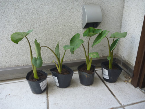 八つ頭です。秋にかけて見事な葉が育つのが楽しみです。サトイモもそうですが、イモ科の葉で庭がトロピカルな雰囲気になると思います。秋を過ぎて霜が降りるころに収穫です。そう思うとタマネギと八つ頭にも季節のうつろいを感じます。