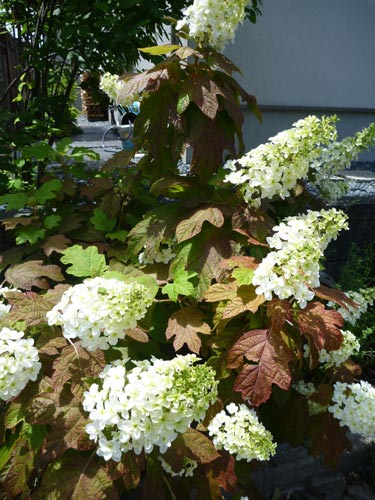カシワバアジサイもきれいに花を咲かせています。梅雨の雨に濡れると、花はいっせいに頭を垂らして下を向いてしまうアジサイです。