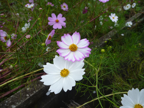 コスモスが満開です。このコスモスはこっちの白とあっちのピンクが交配してこうなったんでしょうね。