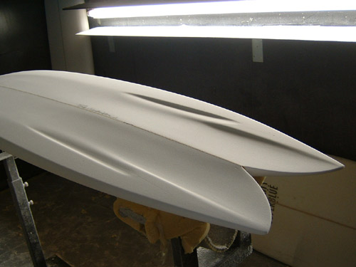 そうやってブランクスを作って、シェイプしてエポキシ樹脂でラミネートして出来上がったのがこの「トロ箱」ボード。何度かテストをして、ウッドのキールフィンを低いものに換えて、最終的には小さなセンターフィンを加えて性能的にも完成したようです。
