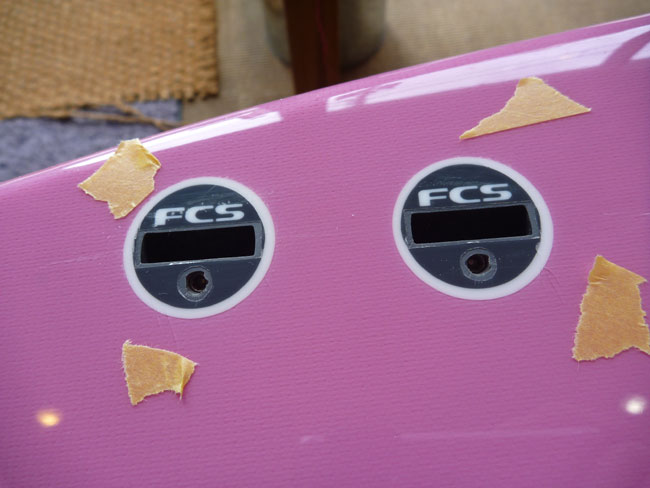 先週、いろいろとフィンを替えてテストしているときに気が付いていたのですが、やっぱりこれはリペアしたほうが良さそうです。FCSのプラグの回りにちいさなヒビを入れてしまいました。それも8個全部のプラグ…。
