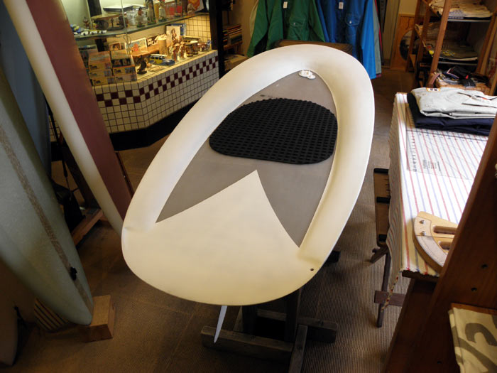 カツさんはバリバリ、シェイプしています。これはニーボード。ウィングが入ったスクエアテール。フィンはクアッドでしょうか。面白そうです。乗ってみたい。