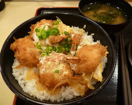 牛丼の松屋のトンカツ版の松八の海老フライの卵とじ丼。