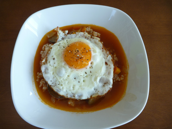 玄米ご飯に昨夜のトマトスープの残りをかけて、目玉焼きを乗せました。見た目よりもかなりさっぱりしています。食べ物のお話はまた改めて。