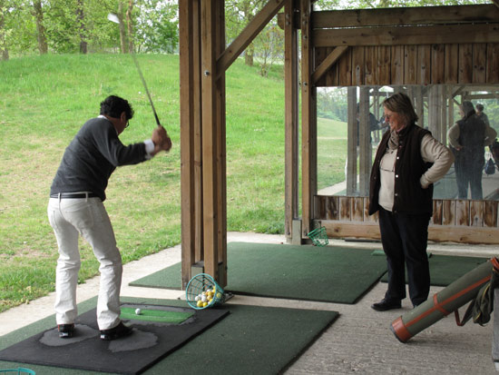 本番前のプラクティス。元女子プロの指導を受けるの図か?