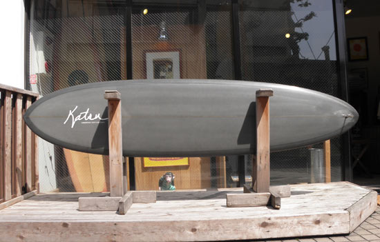 カツさんのフィッシュの特長は丸いノーズ。最近「ラウンドノーズ」という言葉がボードデザインの要素のひとつとして使われるようになってきたのは、カツさんのボードの影響が大きいと思います。2008年9月30日ブログで書いてます。