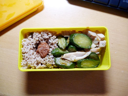 話は変わって、今日のお弁当。しょうが風味に炒めたキュウリに最近我が家の常備菜化している鳥はむを混ぜたもの。キュウリ炒めると意外に美味しいんですよ。ニンニクやショウガと相性がいいです。コツはじっくりこんがり炒めること。