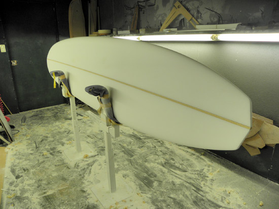 Kさんの3ストリンガー調、ハル・スタビー出来上がりました~!真ん中がレッドウッドのウェッジストリンガー、両側はグルーラインでブラックのラインを入れています。出来上がりだけを見るとフォームに線を引いただけのように見えますが、シェイプしているときにはしっかりとブラックの接着剤の層になっていて、シェイパーさんはウッドのストリンガーと同じようにカンナをかけて削っていきます。