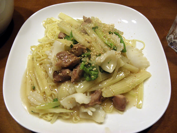 セロリと散歩中にもらったネギ、スナギモとイカのあんかけやきそば。さっぱり目の味付けです。