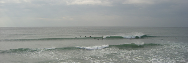 1時間ほどのドライブで海に到着。雲に覆われた空はまだ暗いけれども雨は上がっています。まだ薄暗い海面にはうねりの筋が何本も見えて、岸に近づくと左右に広がりながら白く崩れています。波のサイズはコシ~ハラ。セットは良く言ってムネ。楽しむには十分な波です。