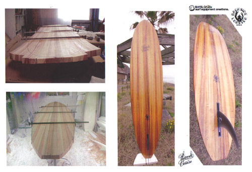 これがエビスさんの最新作。バレルクルーズサーフボード、杉のウッドボード。形を作ってからいったんバラして中をくりぬいているそうです。渋いです。