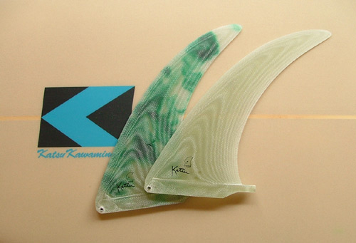 グリーンティントのアブストラクトが入った方は6’8”用で9.5インチ、クリアが7’6”用で10インチのフレックスフィンです。ボランクロスを積層した樹脂板から削りだしているハル・スタビー専用のフレックスフィンです。ボランクロスの丈夫で柔軟性がある特性を利用して、ベース部分から絶妙にフレックスするフォイルで削りだしています。ベースに近い部分はしっかりと芯を感じるフレックスで、ティップに近づくに従い柔軟性を増していっています。