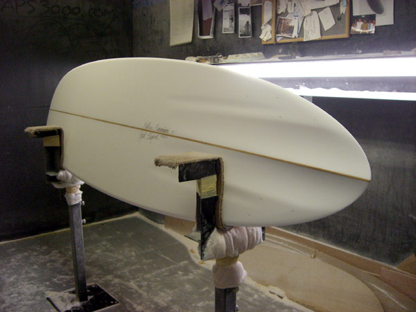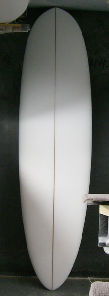 これはNさんのMINI。ちょっと長めに7.1です。フィンは4フィンでコンケーブを入れました。コンケーブが滑らかにつながっている美しい曲面のボトムです。レールにつながるところにも一工夫入れてあります。きっと滑らかに滑ってくれることと思います。