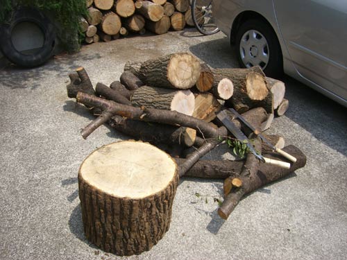 昨日は定休日。朝、パドルでもしようかと車にグライダーを乗せていると強い西風が吹きはじめたので海行きは中止。近くの山へ行って薪の切り出しトレーニングです。コナラとヤマザクラの木です。木の名前も少しずつ覚えて参りました。最終的には燃やしちゃうんですが、丸太コレクションがまた増えてうれしいです(笑)