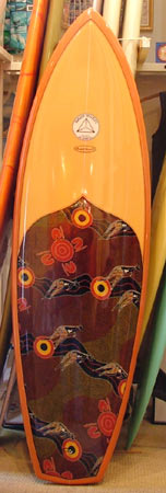 ごらんの通り少し幅広めのテールのアウトラインです。5フィンとの組み合わせで、小波から楽しそうなボンザーです。デッキはアボリジニアートのクロスが入っていてなかなかアーティスティックな雰囲気です。