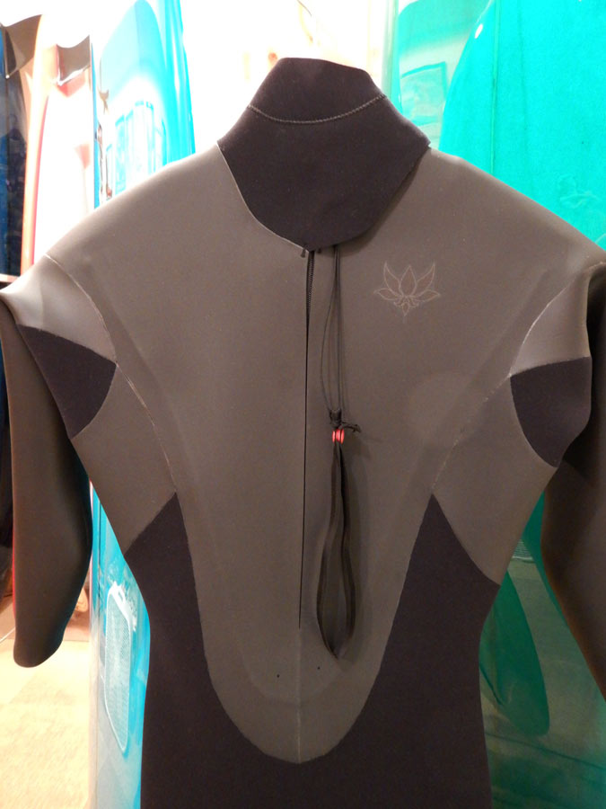 いろいろやってますが、ウェットマニア的にこのウェットで注目しているのは、この新しいジッパーと首回りです。いままでのジッパーと比べると格段に背中のストレスが少なくなっています。試着してみましたが、ノンジップタイプにせまる勢いの背中の柔らかさだと思います。