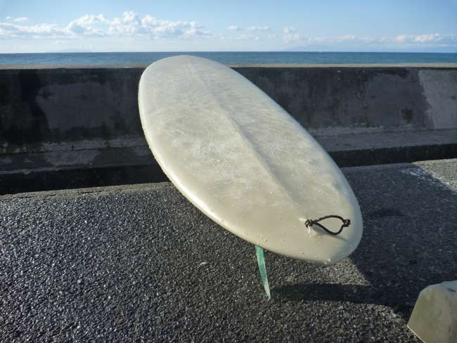なんとなくヒザ・コシ、の波で、8フィートのシングルフィン乗ってみました。8フィートのシングルフィンなんていうと、どんなボードなのか想像つかないかもしれません。