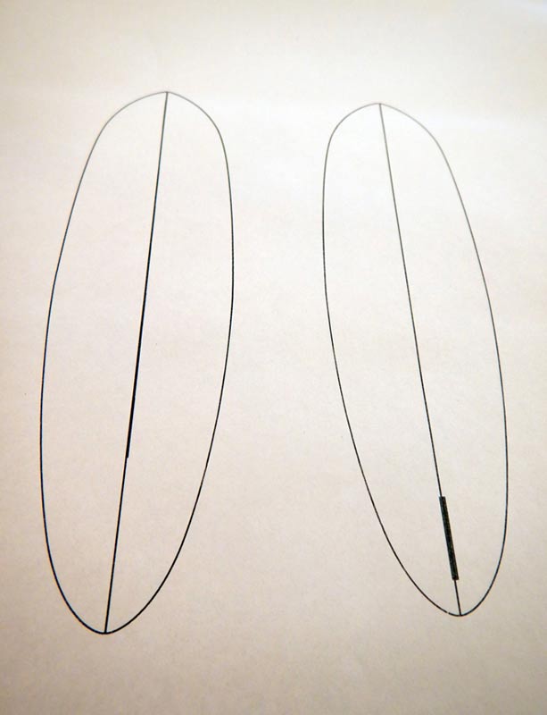 それからこのフィンでも試してみます。WAHOOの8.75(左)、面白そうです。右は今回使ったプリモ9インチですが、レイクは同じくらいでもWAHOOの方がベースが細くなります。ベースが細くなる分を考慮しつつ、ティップが来る位置を考えて使ったら、面白いことが起きそうな気もします。
