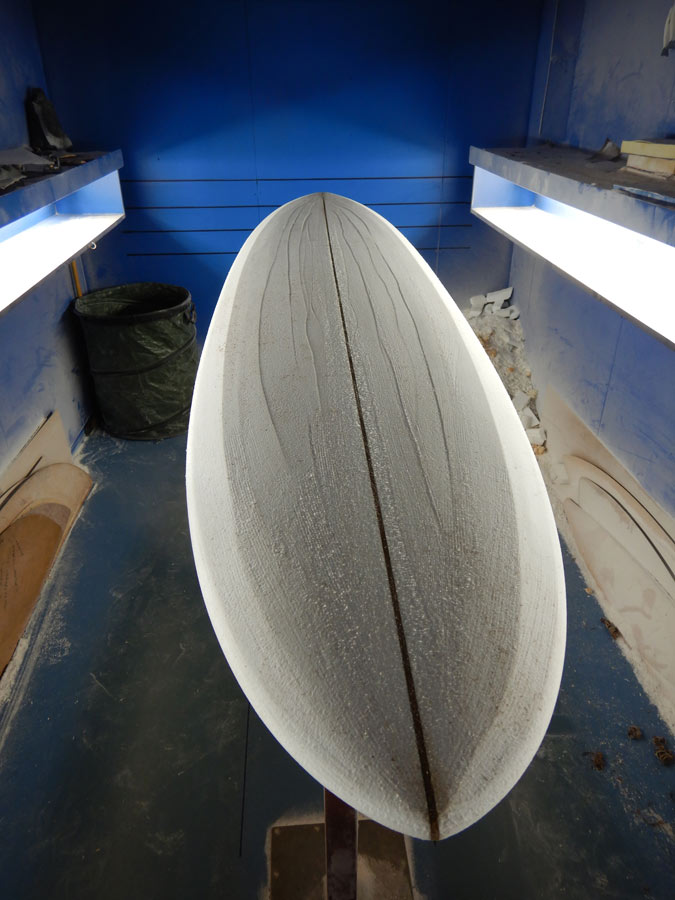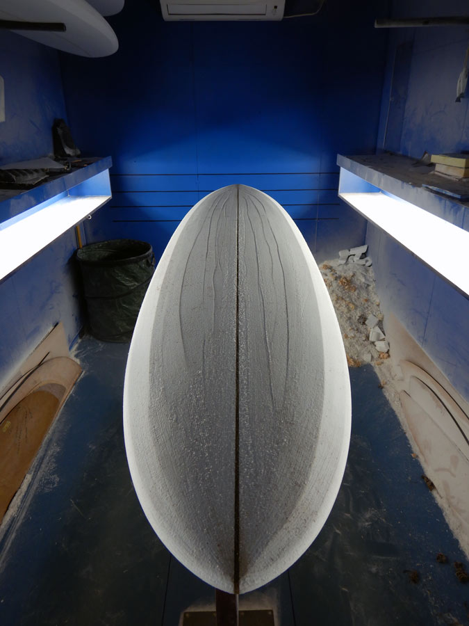 いろんなコンディションをカバーしてくれます。カングーが仕事でお預かりしているボードで満タンでも、すき間に一本入れていけばそれでOK。一番出番が多かったお気に入りの8’4”のプリモの二号機として作った、8フィートちょうどのプリモです。