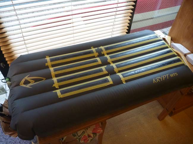 写真は滑り止め(ウェットボンド)を塗るのに空気圧を高めにしていますが、使うときにはマットが半分に折れ曲がるくらいの空気圧で使います。