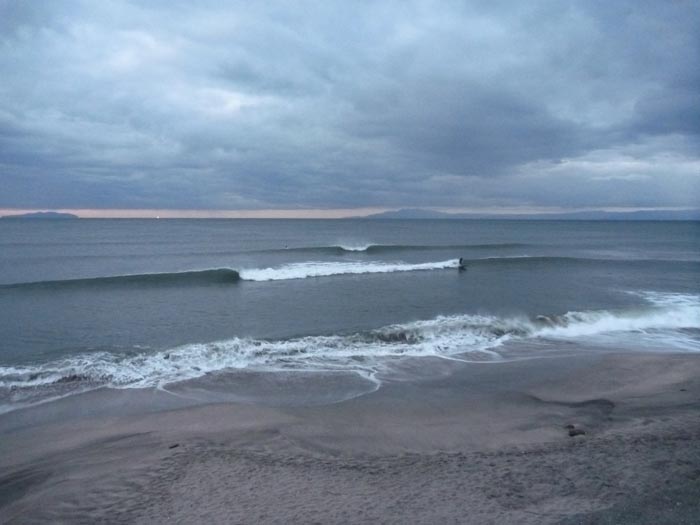 またフラットだったらショック大きいなあ~と思いながら夜明けの海へ到着。薄暗い中にちょこっと筋張ったものが見えて一安心。ロングボードならなんとかなりそうです。こないだみたいに何もできずに帰るのはちょっと悲しいです…。