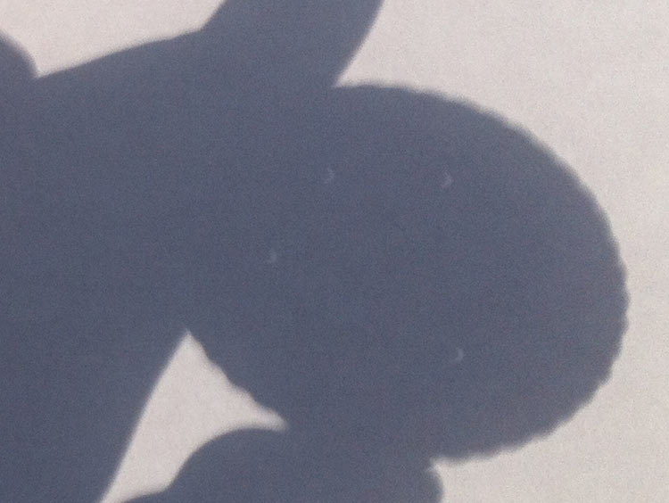 はじめは太陽の右上が小さく欠けはじめ、だんだんと月の丸い影が太陽を覆っていって細い三日月のような形になりました。それに伴って辺りが薄暗くなり、さらに丸い月の影が中心へ向かって動くと三日月の両端がつながって、見事に丸い光のリングになりました。
