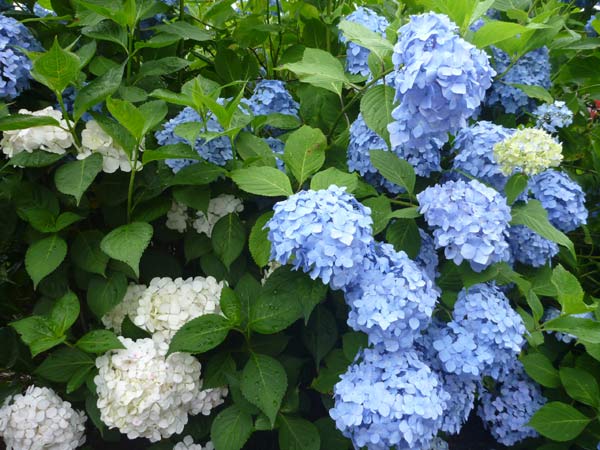 白、ピンク、青、紫といろんな色があります。土によって色が変わるようですが、リトマス試験紙みたいにアルカリだと青くなるのかな?