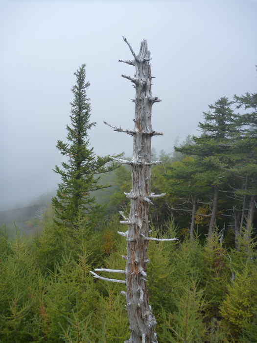 立ち枯れしたカラマツ。霧がサッとやってくるとあたりは白い世界。枯れ木もなんだか美しく見えます。
