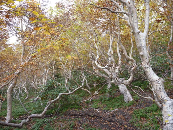 これは何の木?冬の積雪と強い風の厳しい自然条件で幹がうねって矮性化しています。うねった白い幹に黄色くなった葉がきれい。