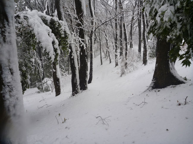 午後になって、ますます雪が強くなって積雪も深くなってきたので、雪を楽しもうと雨具を着て裏山を歩いてみることにしました。