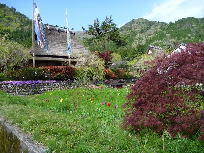 かやぶき屋根の家が大切に保存されている地区。かやぶき屋根とこいのぼりと草花。すべて自然の色ですが、すごい色です。