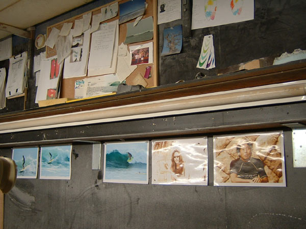シェイプルームの壁にはいろんなものが貼ってあります。下の写真は先日の台風12号のときのもの。右からカツさん、トシさんとライディングはカツさんと中村清太郎さんです。サーフィンカメラマンではないカメラマンが撮っているので、シャッターのタイミングが新鮮です。