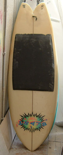 こんな感じ。ハワイのブラスト。片腕のニーボーダー、バドマックレイさんのニーボードです。テールロッカーに特長があります。スキップやクリスのフィッシュにも共通点があります。このニーボードはパイプラインかバックヤード用か…かっこいいです。