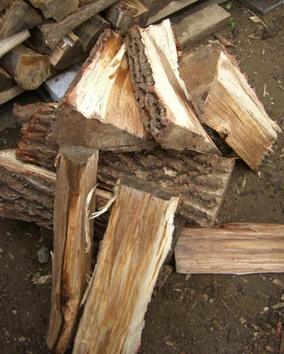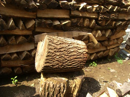 ついでに去年薪割り台に使っていた丸太も割ってしまいます。一年ほっといたので少し腐りかけています。本当に腐っているわけでないのですが、割らずに丸太のまま放置しておくとコルクみたいに軽く柔らかい感じになってしまいます。私は「ボケる」と呼んでおります。割って水分が蒸発しやすくしてあげないと薪にはならないのです。上の写真の木と違う感じが分かると思います。