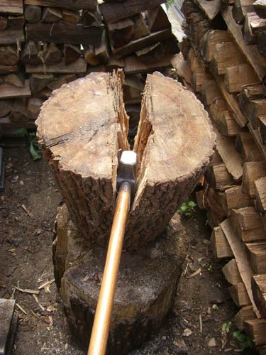 割って割って、一日分くらいにはなるかな?本当は太い丸太を割るにはクサビを使うと簡単なのですが、割れない丸太はタマにしかないので持っておりません。なんとかなるもんでもあります。