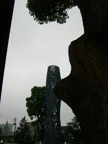 待ち合わせの間に。無機質なオブジェと並木の樹木が作りだした構図。