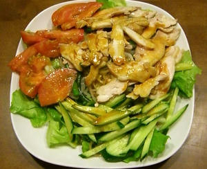 一品目は冷麺。切った野菜と茹でた鶏肉の薄切りを乗せて、ゴマだれをかけていただきま~す。トマトとキュウリとトリ肉はどれもゴマの味が良く合ってウマイ。ゴマだれは市販のたれです。酒はビールよりも焼酎のロックかな~。
