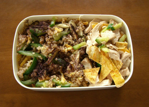 で、久しぶりの今日の弁当。キュウリとミョウガ、椎茸と錦糸玉子と鶏皮のちらし寿司弁当。皮をはいだ鶏の本体は薄焼き卵の余りと出来たばかりの梅酢で和えてみました。ちらしの上にはこれまた出来たばかりの「ゆかり」をふりかけ。酸味が美味しいです。(ゆかりも梅酢も梅干の副産物です。)
